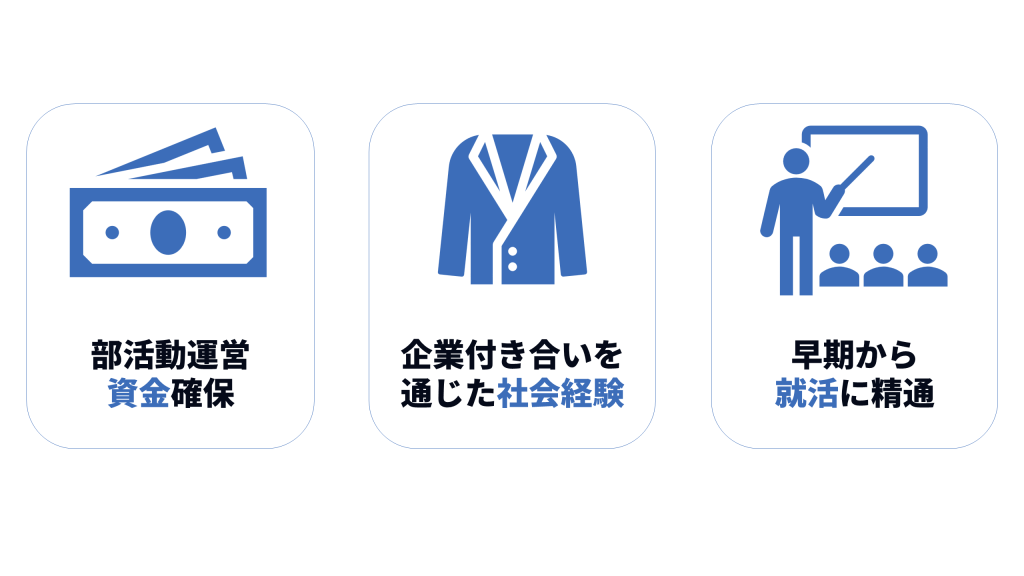 スポンサー契約を結んだ企業との付き合いを通じて、学生のうちから社会経験を得ることができます。